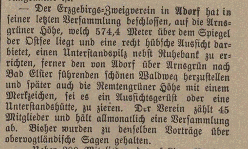 Aussichtsturmes, des nach ihm genannten Ernst-Turmes auf der Remtengrüner Höhe auf Kosten des Vereins. Die auf dem Berndtschen Grundstück errichtete Warte verursachte dem
