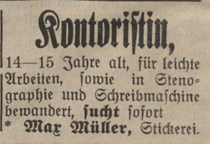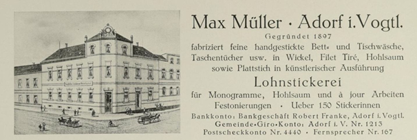 Anzeige vom 7. Januar 1932 suchte die Stickerei Max Müller im Adorfer Grenzboten eine junge Kontoristin für leichte